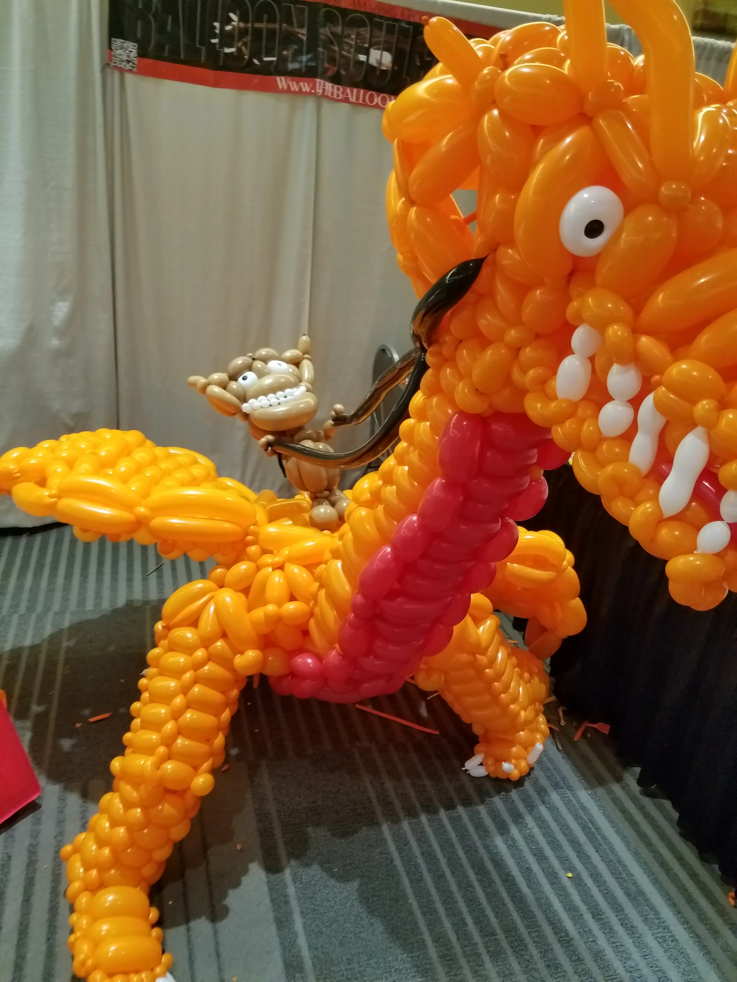 The Gencon water balloon dragon stands tall, ready to unleash a playful attack on the balloon sculptor.