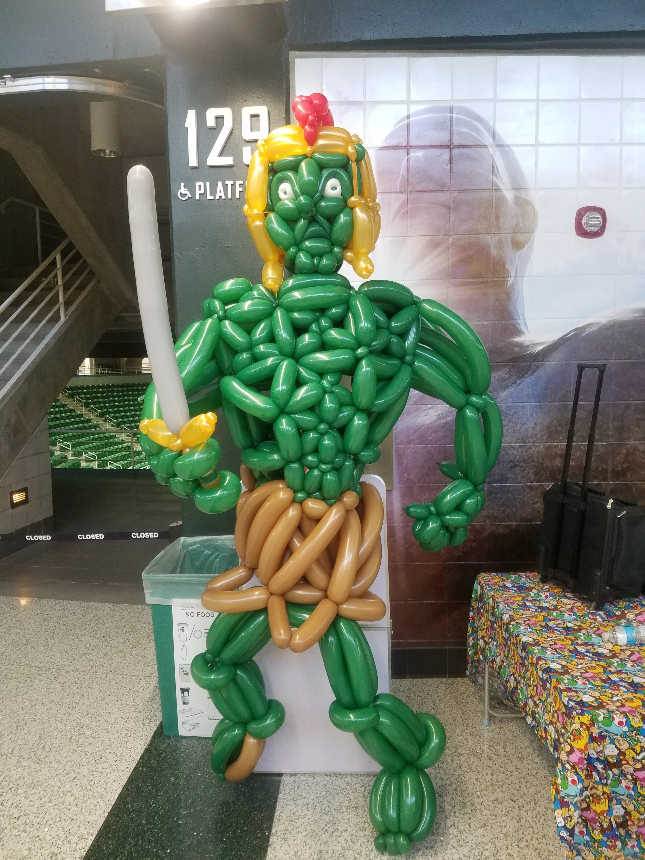 This particular piece was the first large balloon the sculptor created for a comic convention. It stands approximately 14 feet tall and took around 8 hours to finish.